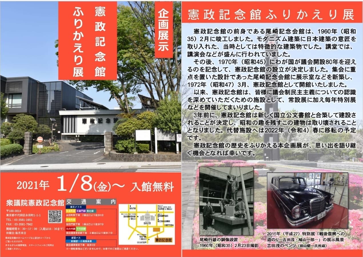 憲政記念館では令和3年1月8日(金)より、企画展示「憲政記念館ふりかえり展」を開催します。
